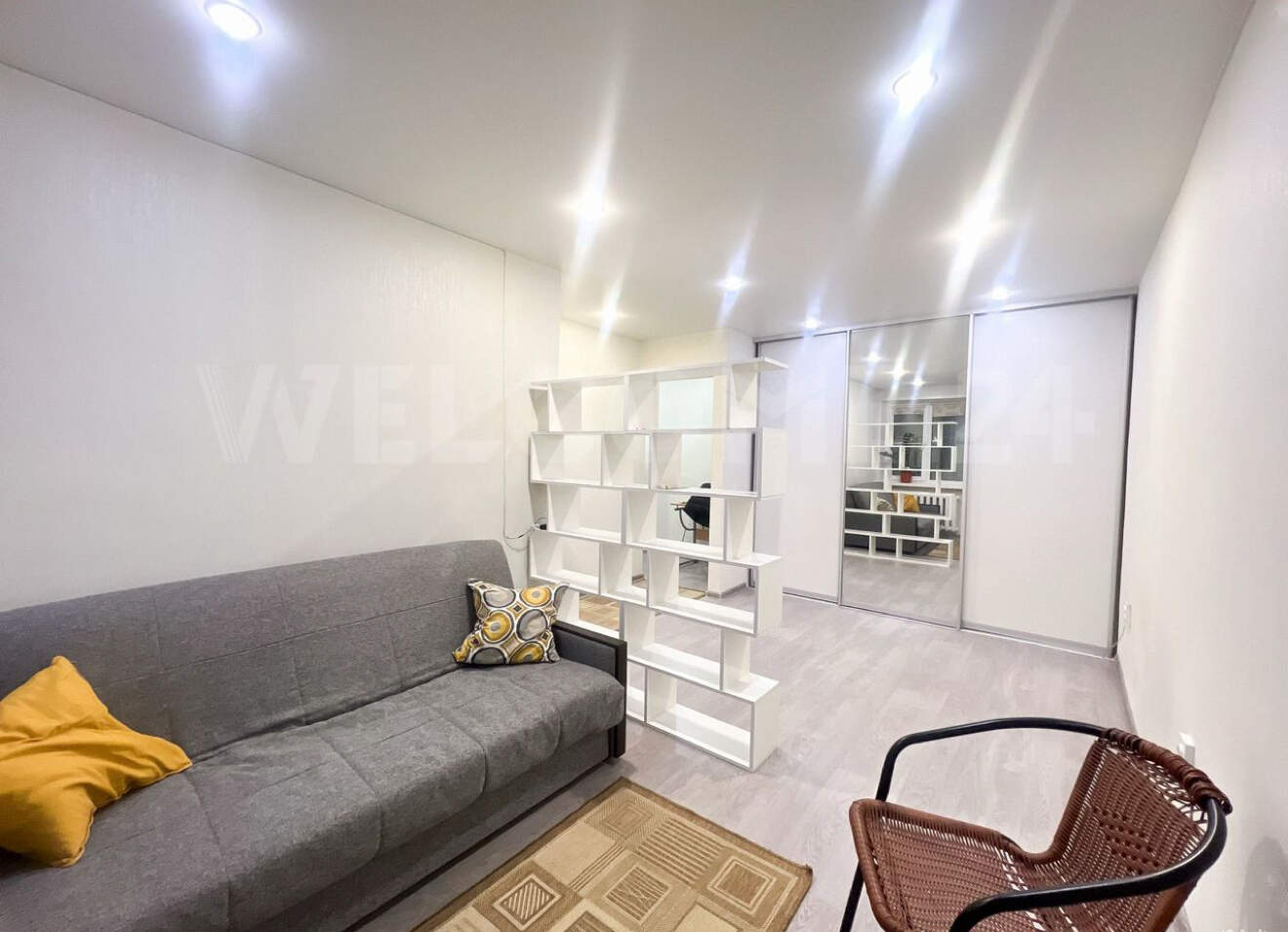 В гостиной: диван, стенка, шкаф купе.