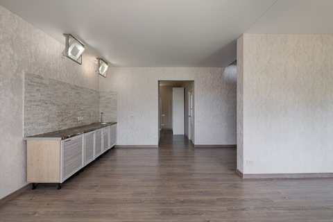 · Просторная кухня-гостиная, где зонировано место искусственным камнем под Ваш будущий камин .