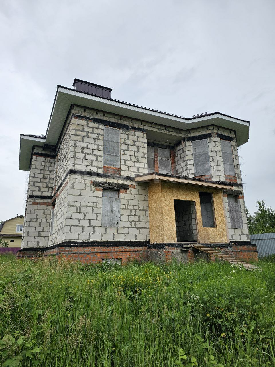Дом построен из пенобетонных блоков и красного кирпича, перекрытия - ж/б плиты, что обеспечивает долговечность конструкции.