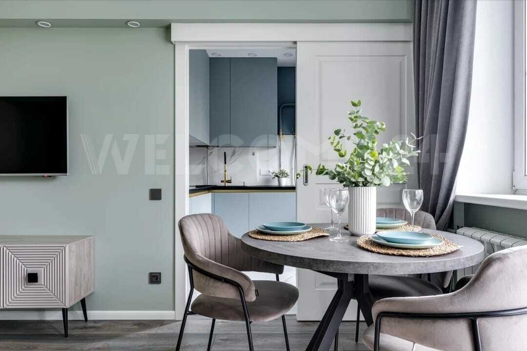 Кухня гостиная полностью укомплектована необходимой техникой (посудомойка, духовой шкаф, варочная панель, вытяжка, телевизор, чайник). Готовить на ней одно удовольствие. Утреннее солнце, через стеклопакеты, создаст настроение на весь день. Функциональная планировка включает в себя одну изолированную комнату, просторную гостиную и выделенную зону кухни, что даёт возможность каждому члену семьи заниматься любимым делом, не мешая при этом остальным.