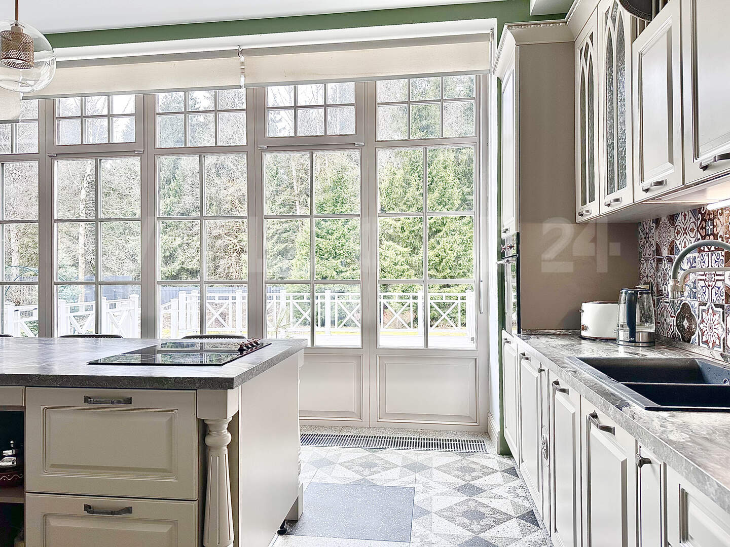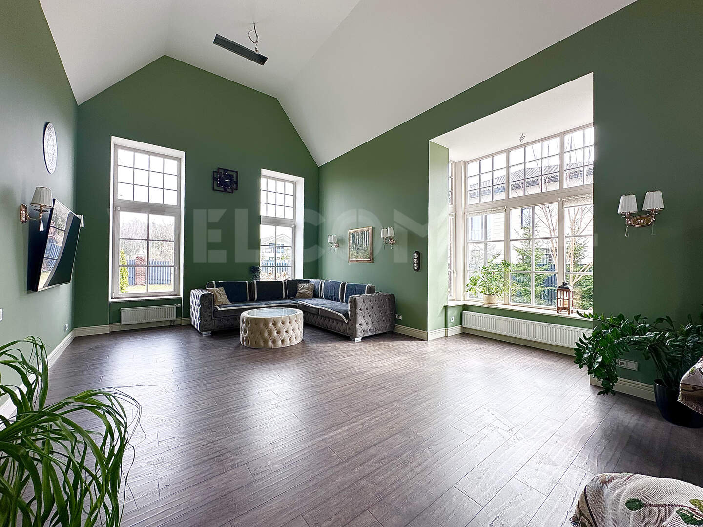 • просторная гостиная со вторым светом, панорамными окнами и выходом на террасу;