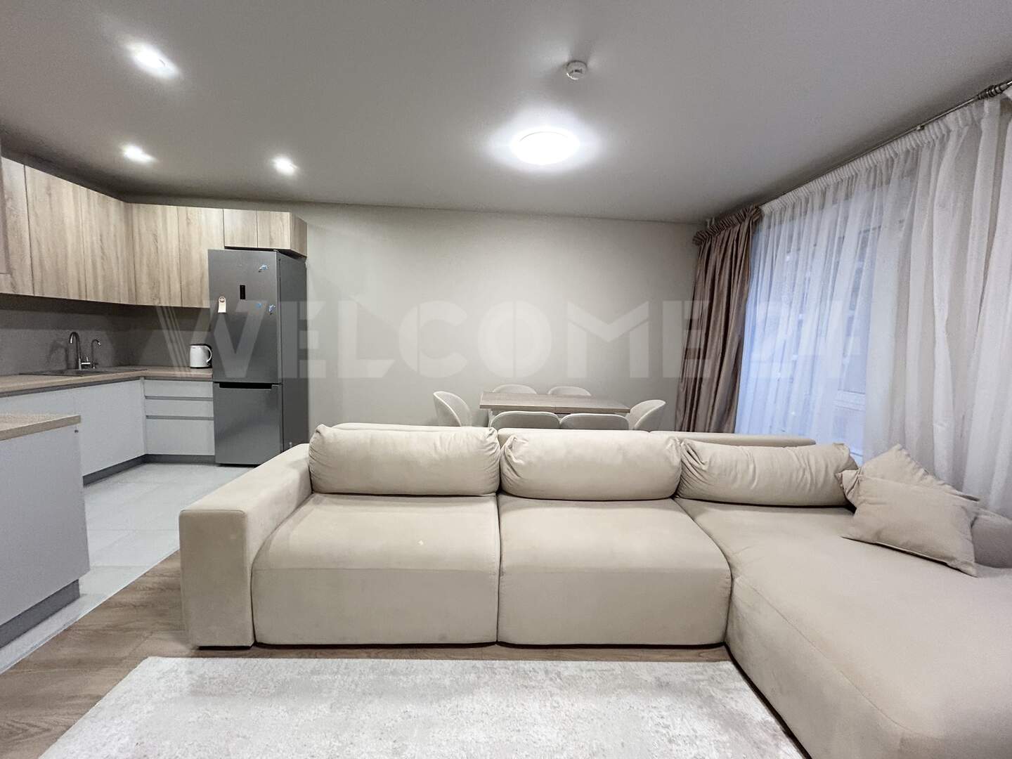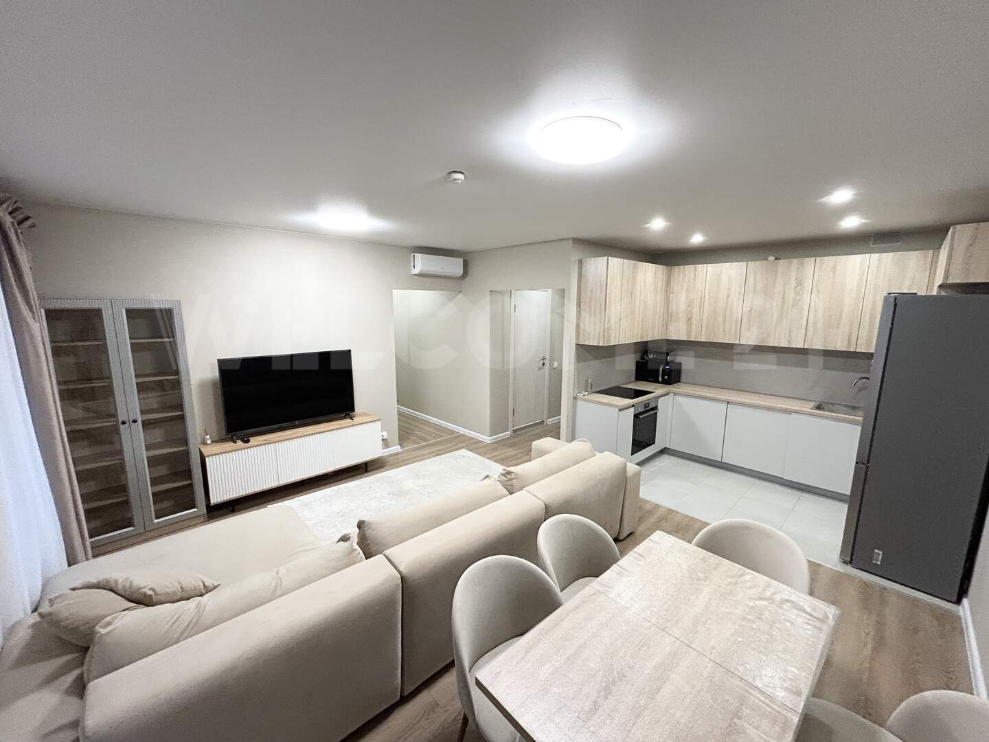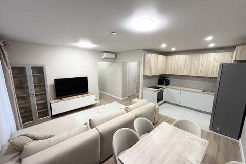 З светлые спальные комнаты с мебелью и местами для хранения вещей. Просторная кухня- гостиная с мягким, удобным диваном, телевизором и обеденной зоной.
