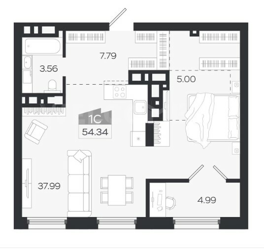 • Общая площадь: 54,34 м²