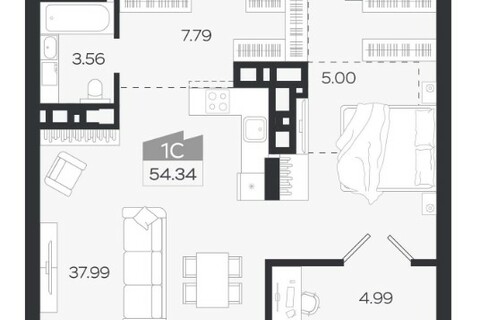 Просторная площадь - 54,34 м² общей площади, из которых 39,7 м² - жилая. Это не просто однушка, это полноценная квартира-студия с возможностью зонирования.